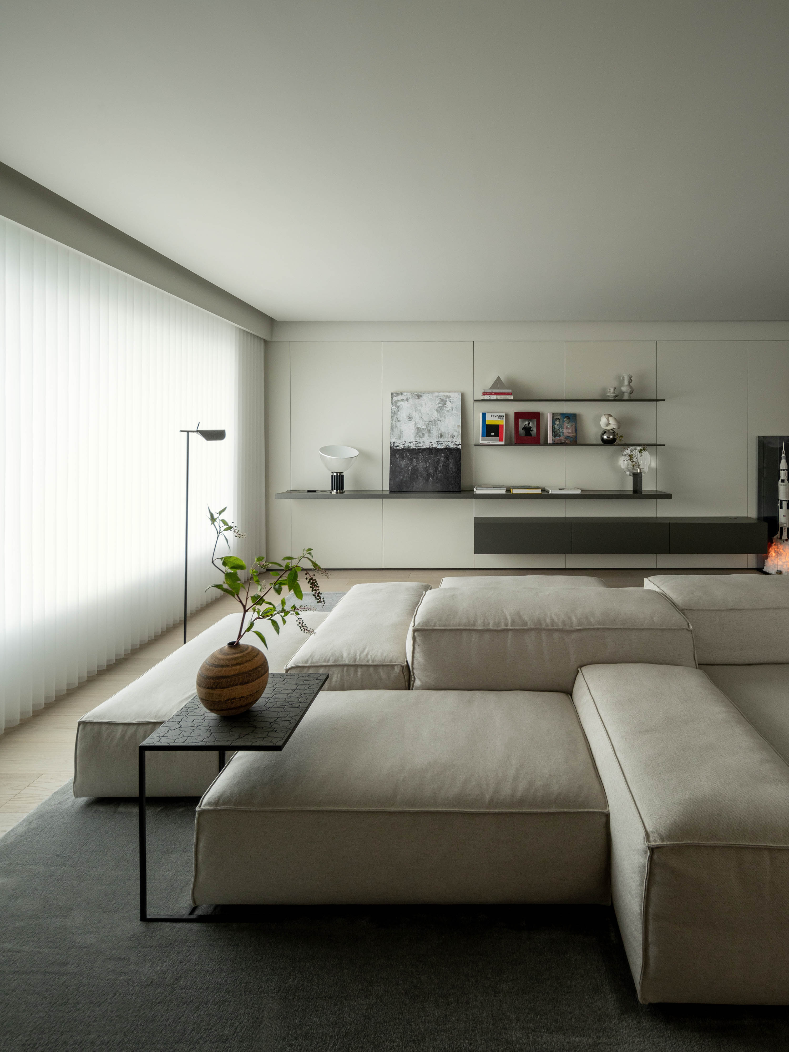 我们以“豆腐块”沙发为空间锚点,进行了一场“去中心化”设计实践,主动摒弃了传统的电视背景墙。由此,客厅的视野从单向的凝视,转变为动态的环绕,最终塑造出一个鼓励面对面交流、充满呼吸感的社交场所。