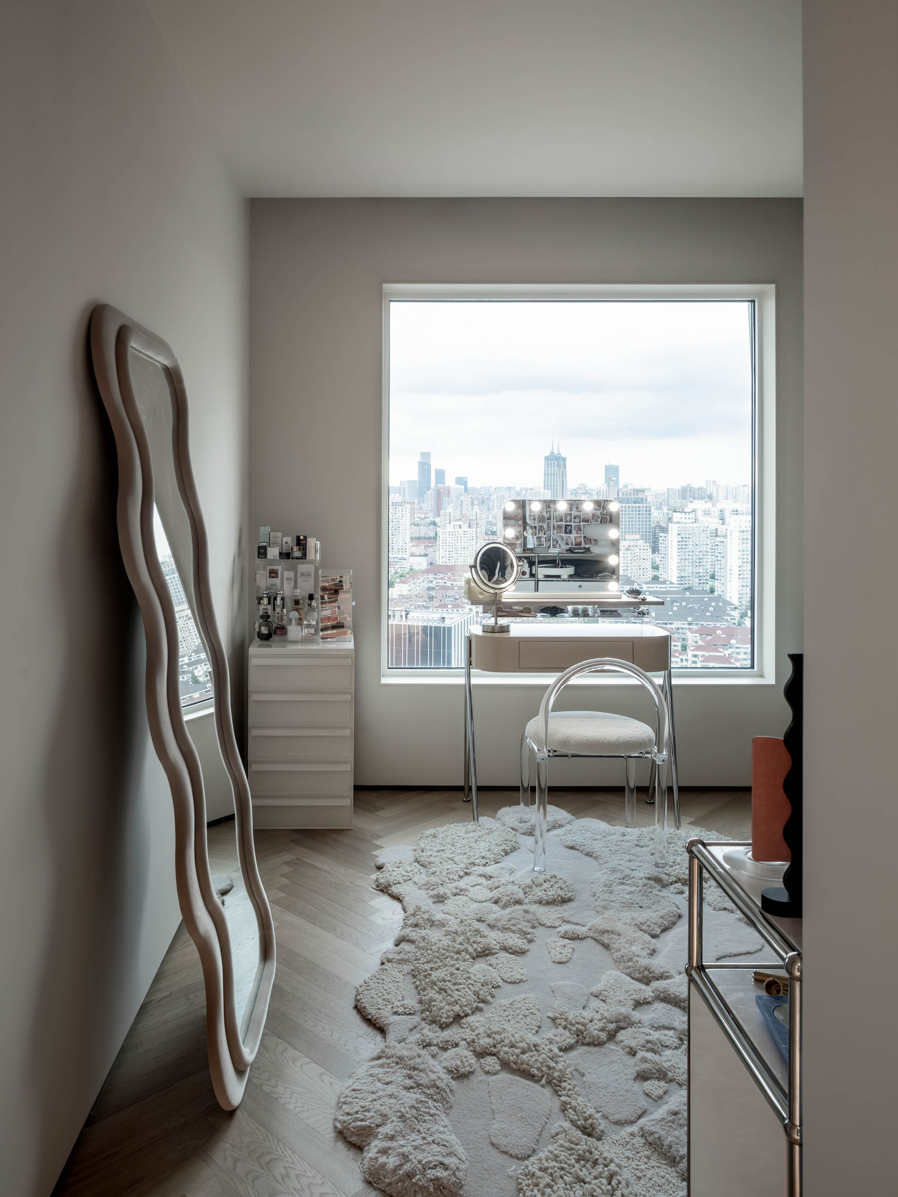 这是专为女主人打造的复合空间,既是专注创作的工作室,也是日常梳妆的惬意角落。房间拥有开阔的视野,可远眺城市天际线,自然光与城市夜景在此交替成为最美的背景。