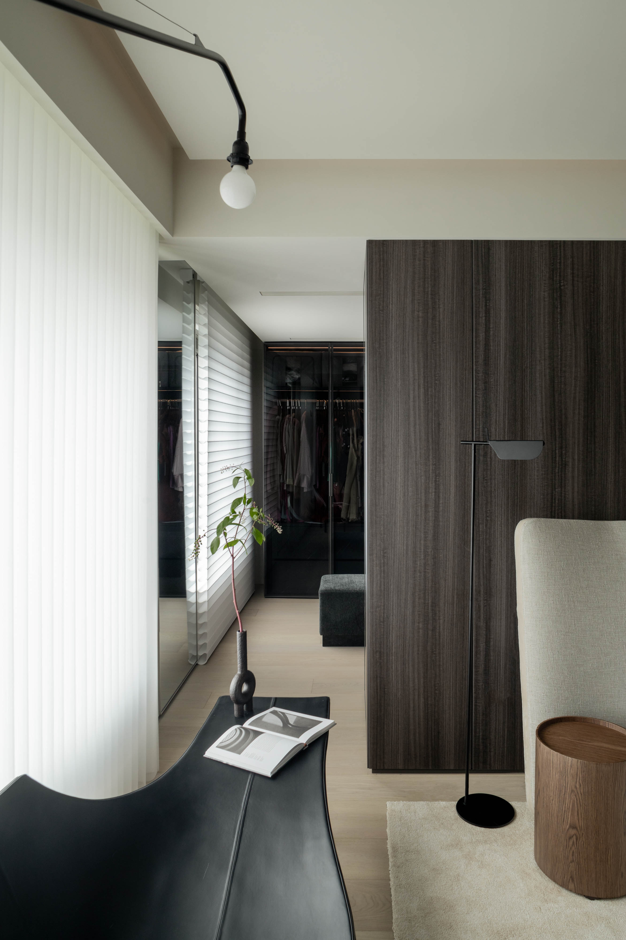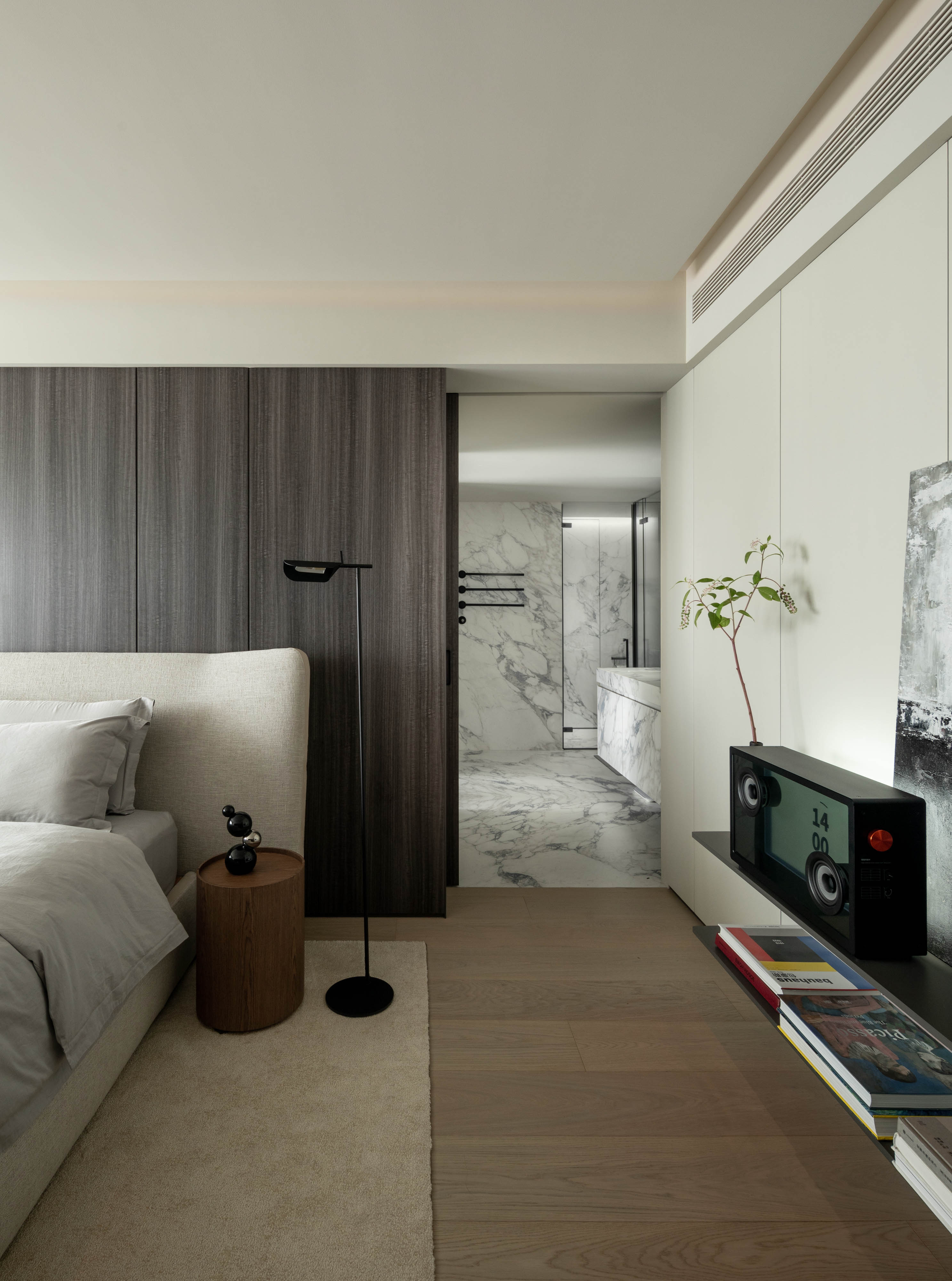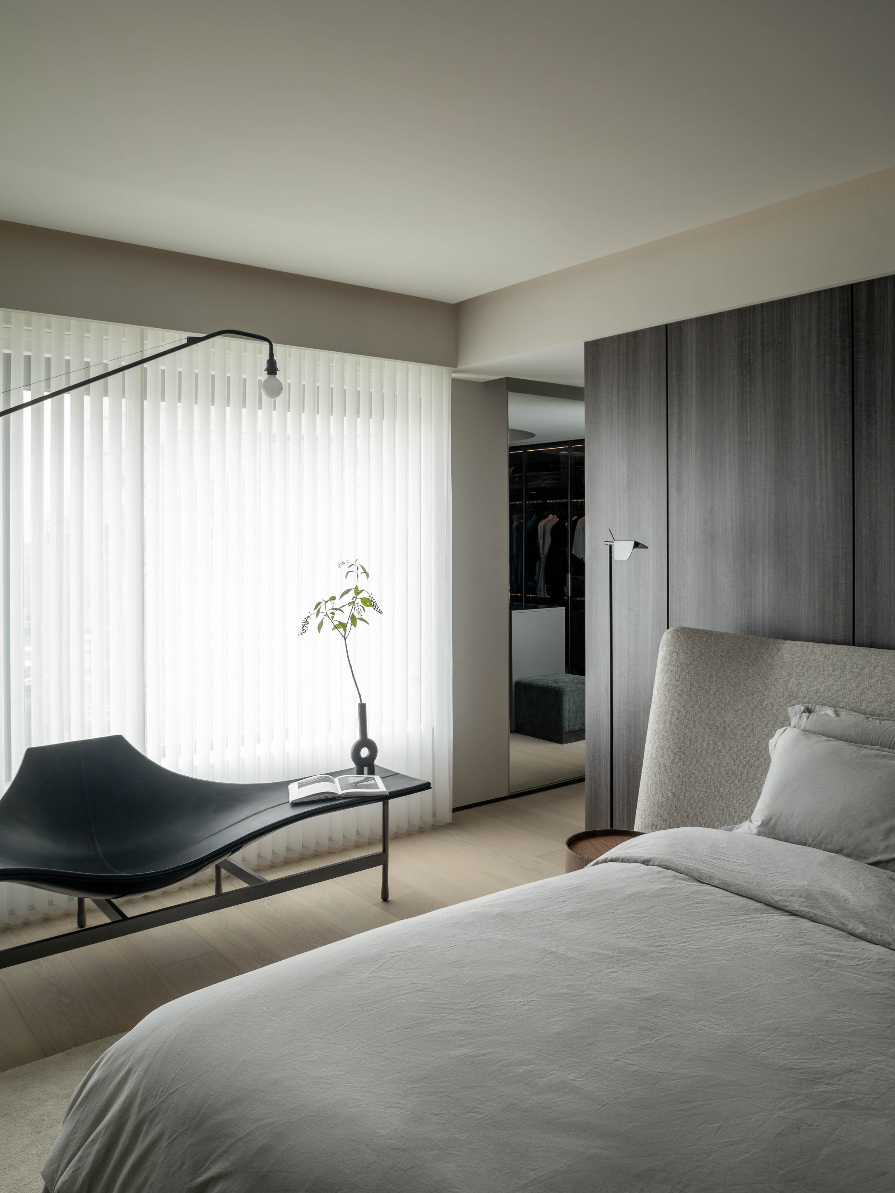 主卧空间以深灰色的天然木质背景墙奠定沉稳基调,其清晰的木材纹理为室内注入了自然的呼吸感。背景墙与脚下温润的白橡木地板和谐相接,共同构筑出宁静而包容的场域。在自然木质与柔和织物的包裹中,凸显出高级而现代的格调,最终达成理性审美与感性舒适的诗意统一。