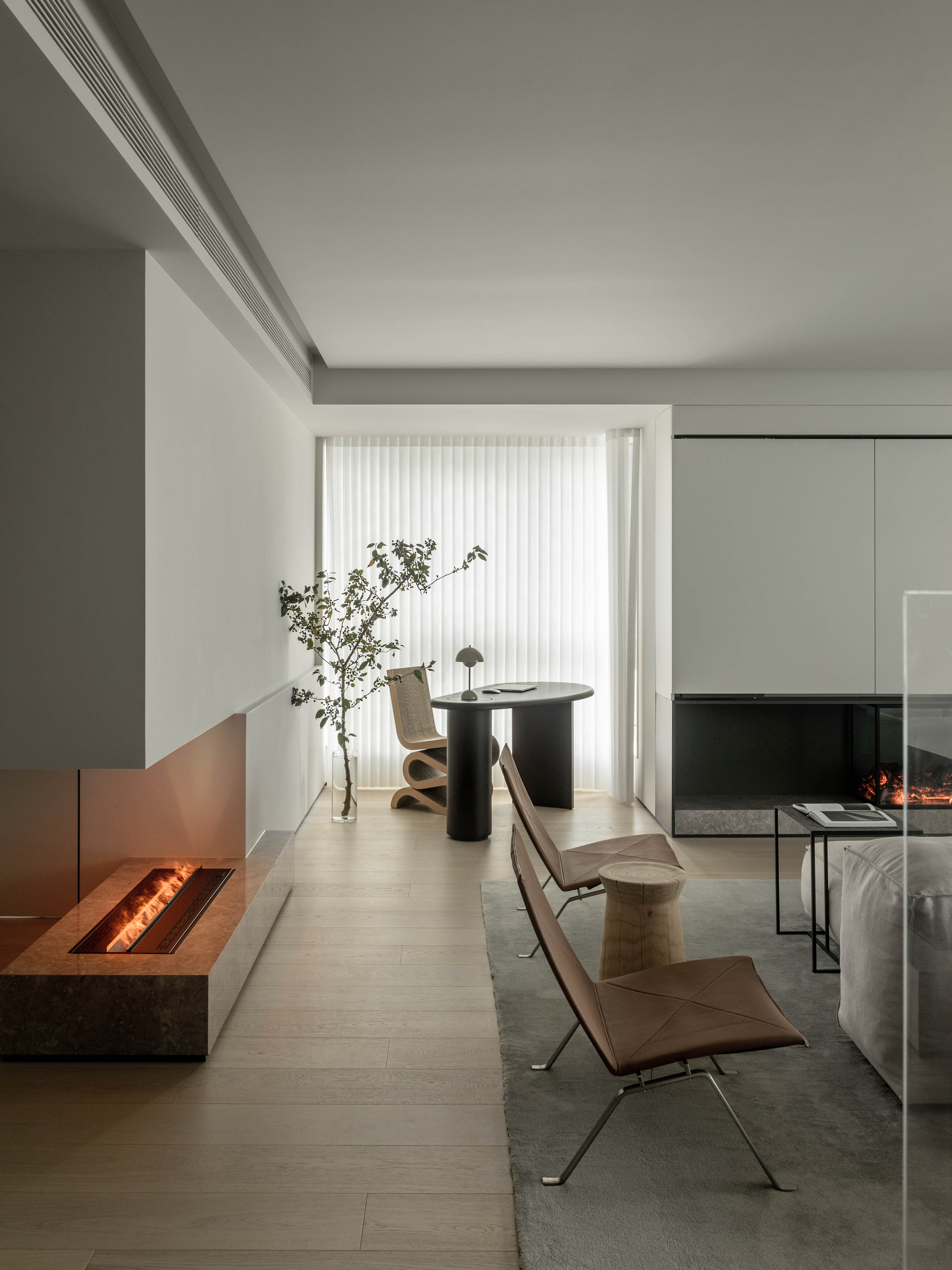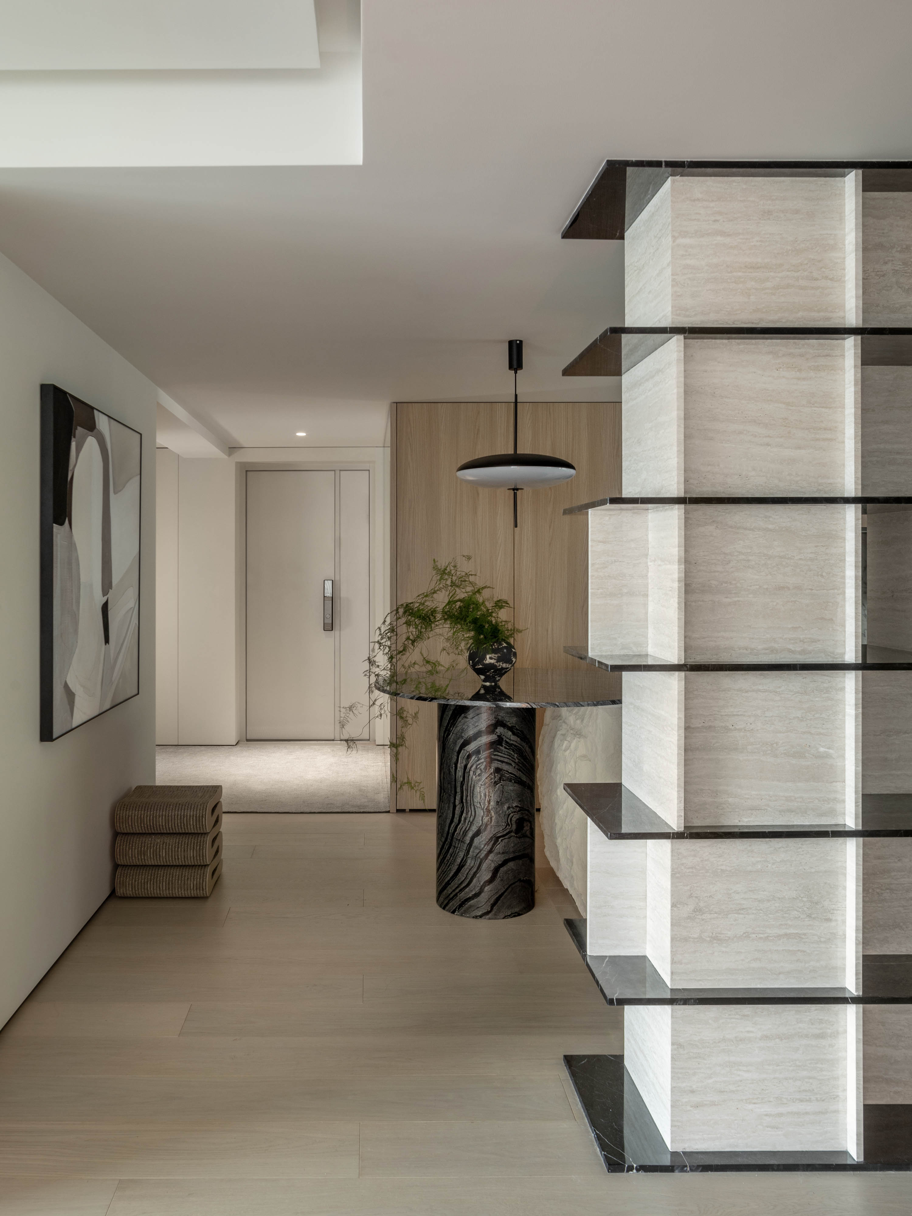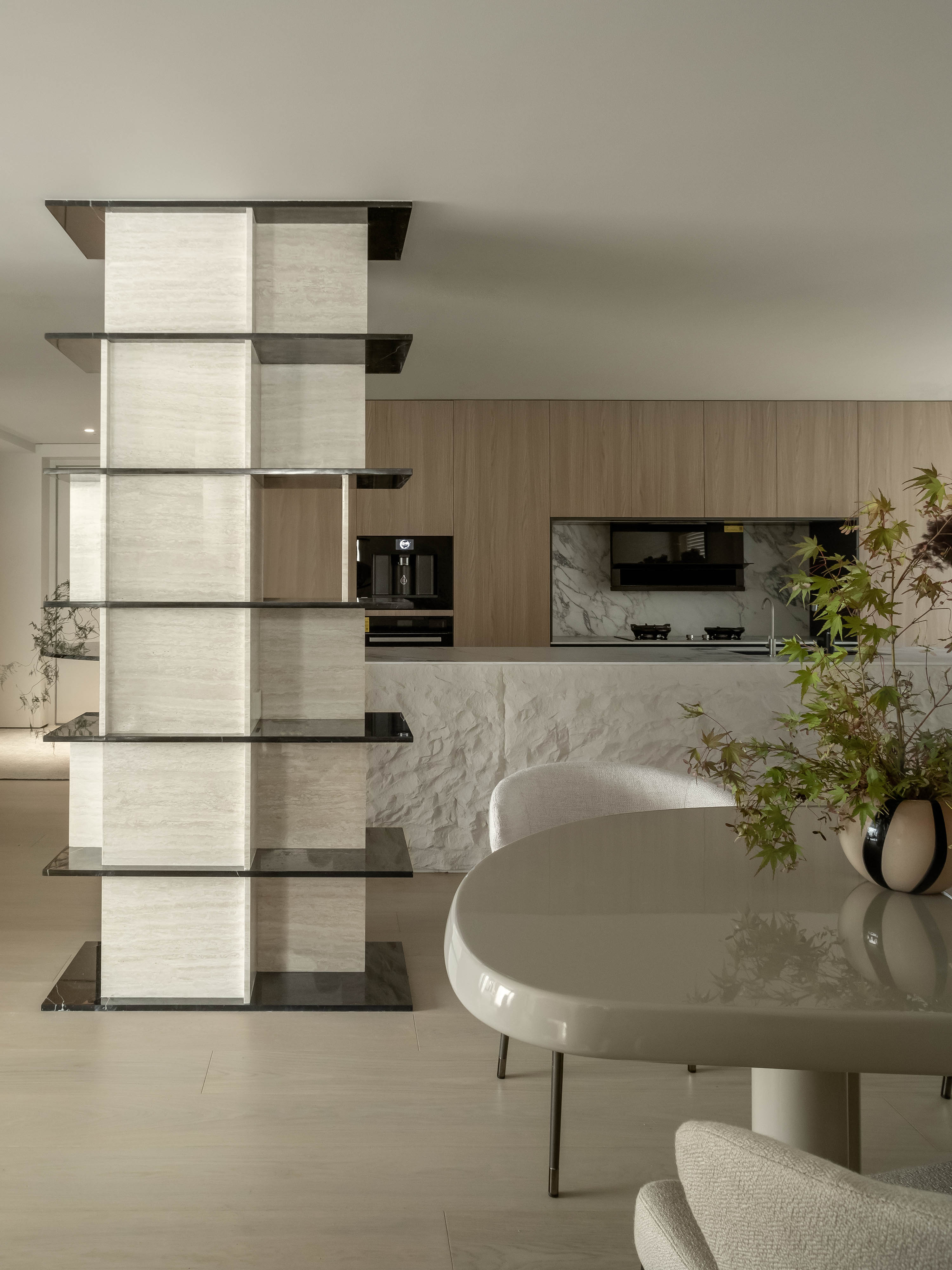 在餐厅与走道的交汇处,一根原始结构柱是无法回避的存在。我们并未试图刻意隐藏,而是选择将其重塑为空间的视觉核心。使其成为一个功能性的艺术装置,极大地丰富了空间的叙事性与趣味性,让每一次穿行都成为一次赏心悦目的旅程。