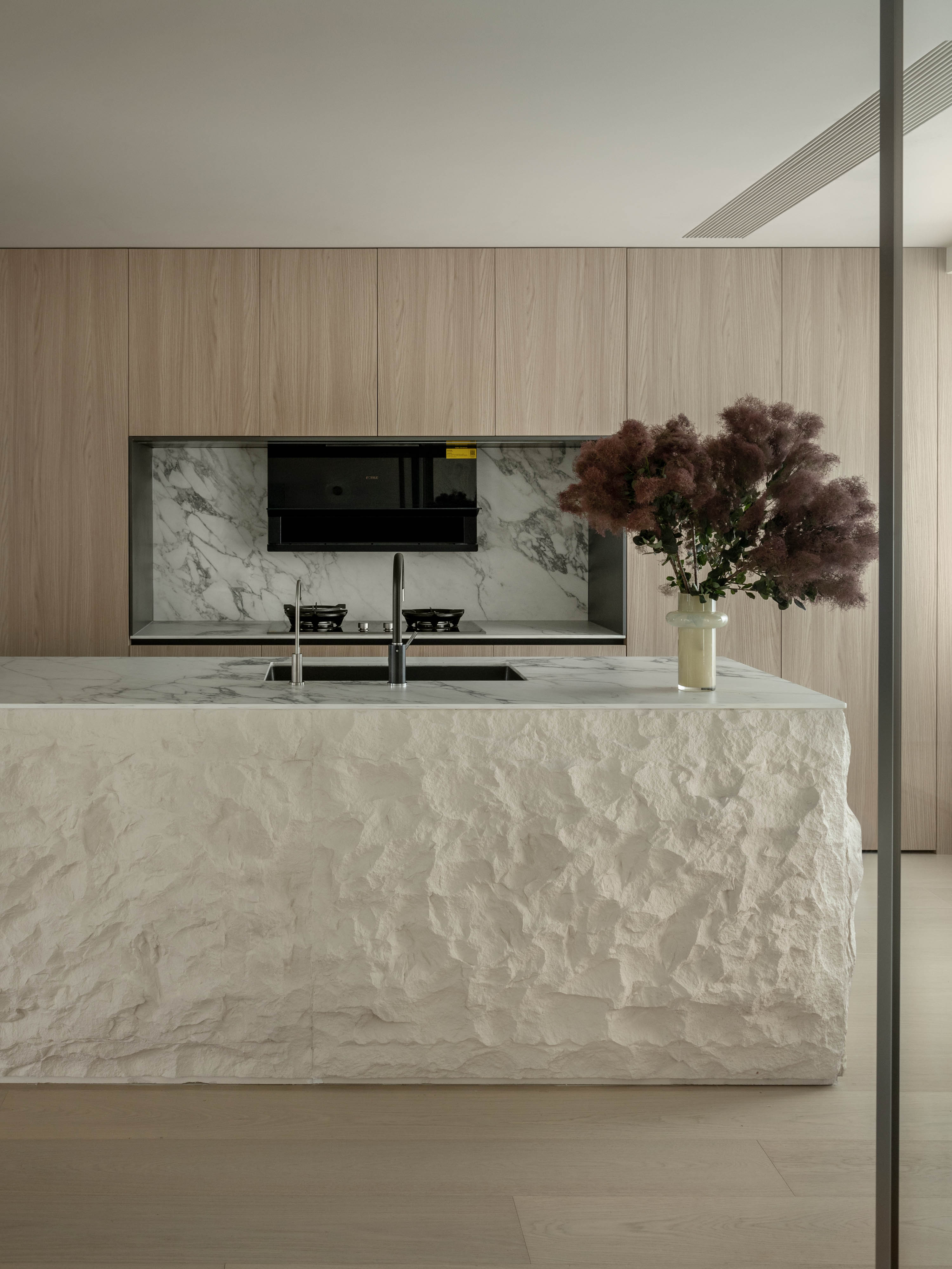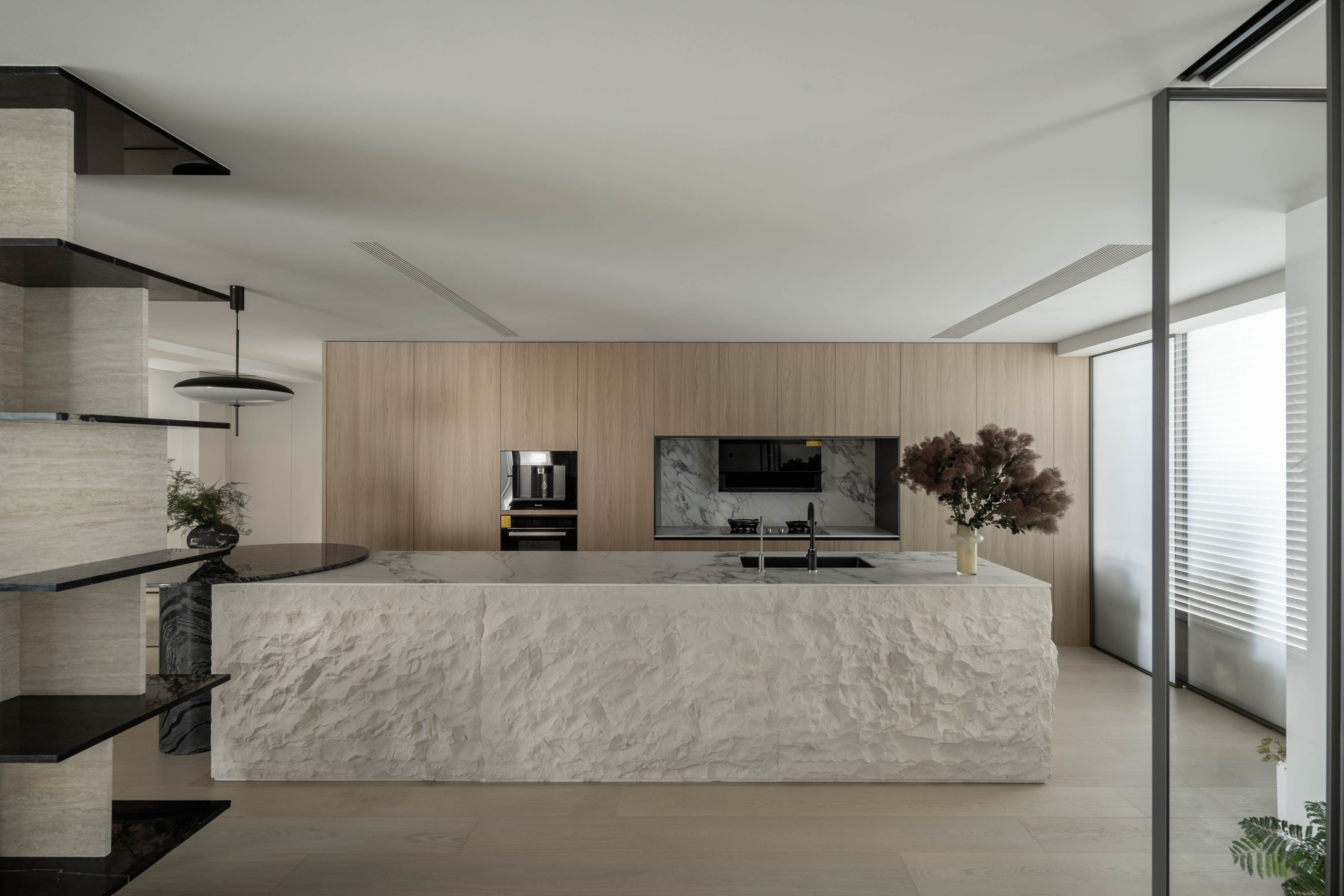 西厨中岛是整个开放空间的灵魂所在。其台面选用手工凿刻的西班牙砂岩,保留了原始而粗粝的天然肌理,触感与观感皆宛如历经海浪冲刷的礁石,蕴藏着强大的自然力量。这一厚重的质感,与周遭橱柜、墙顶面极其细腻利落的极简线条形成了强烈的视觉碰撞。它不仅仅是一个功能性的操作台,更是一个隐喻,揭示了家既是温柔港湾,亦是人生坚实基石的深层内涵。