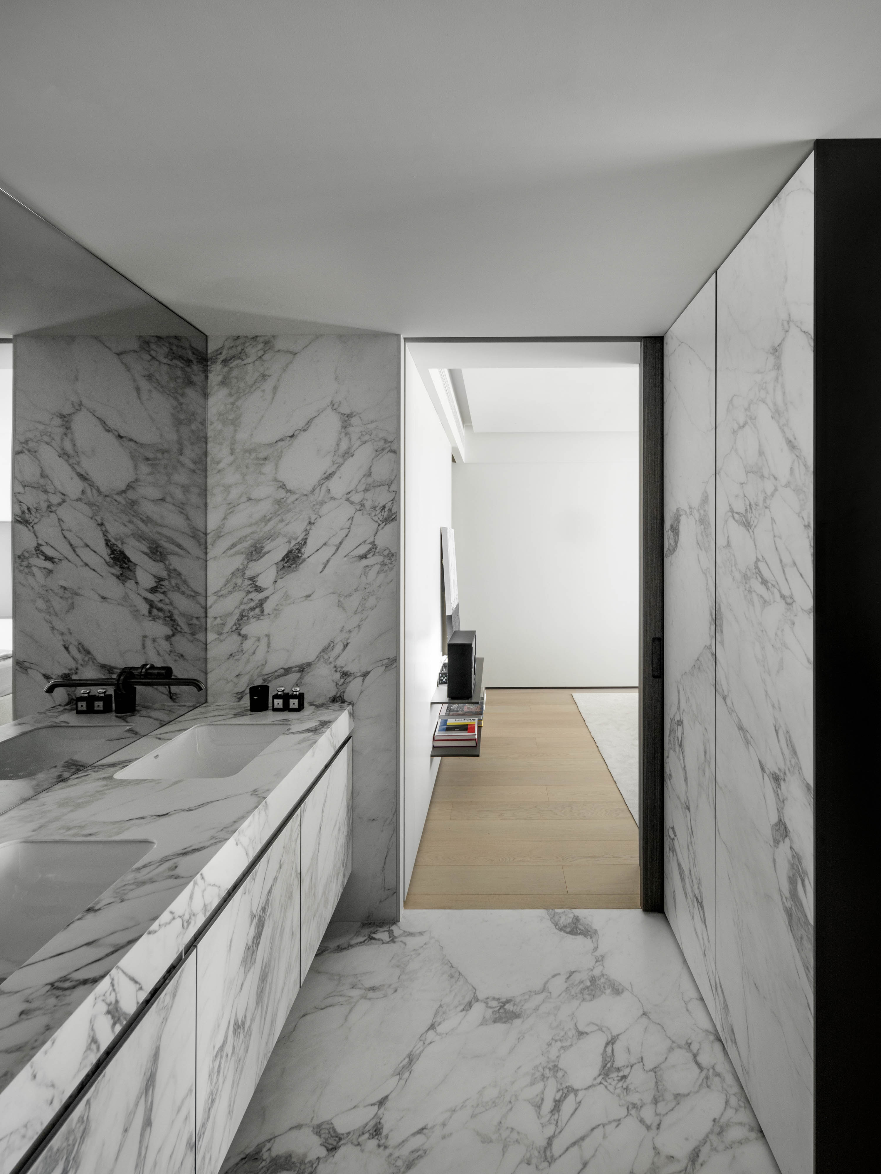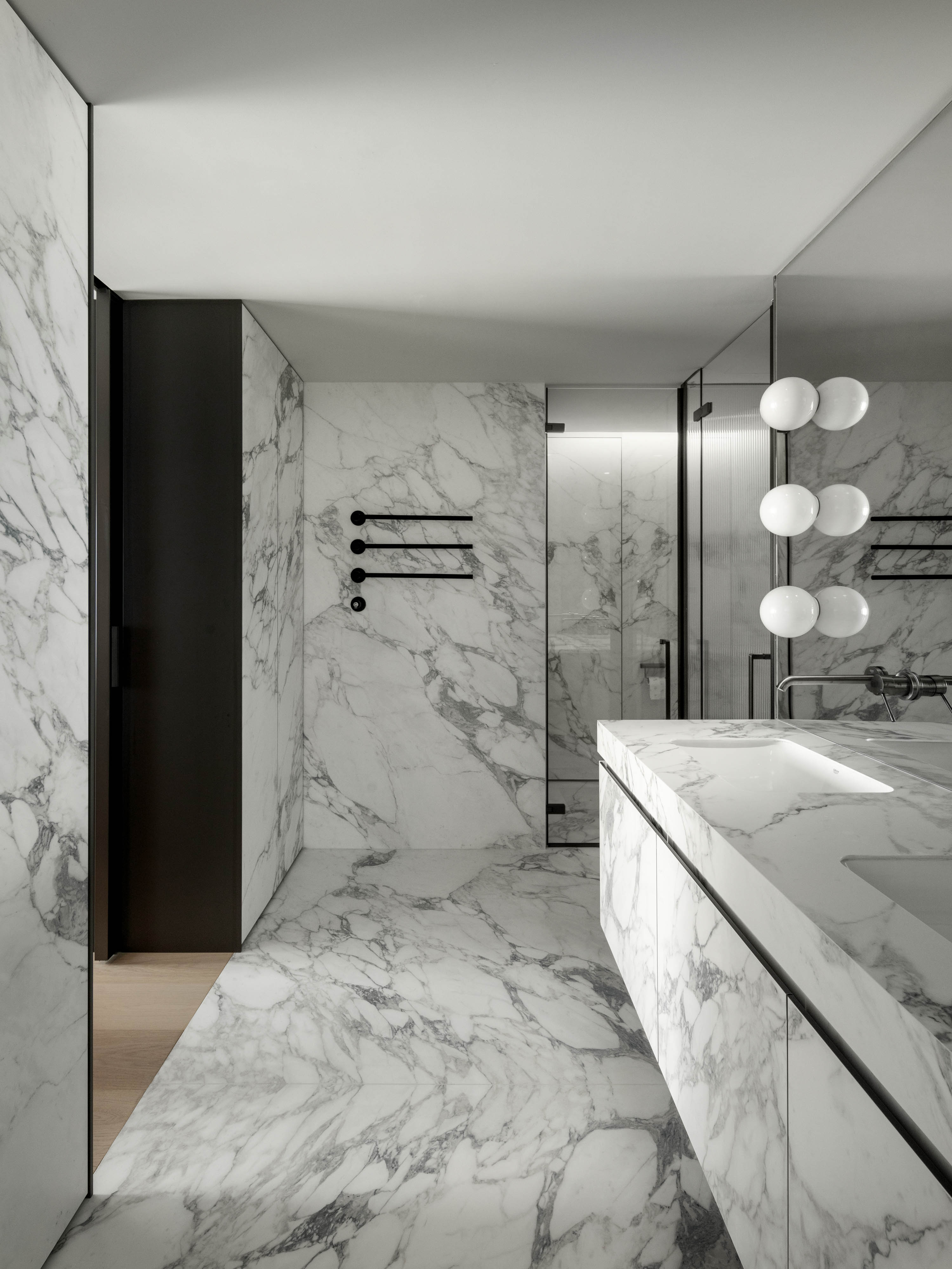 主卫生间采用“鱼肚白”岩板满铺,墙面与地面一气呵成,彰显着极简的魄力。石材上如水墨般挥洒的自然肌理,每一寸都诉说着独特的艺术美感,精致的金属龙头或内嵌的灯带成为点睛之笔。