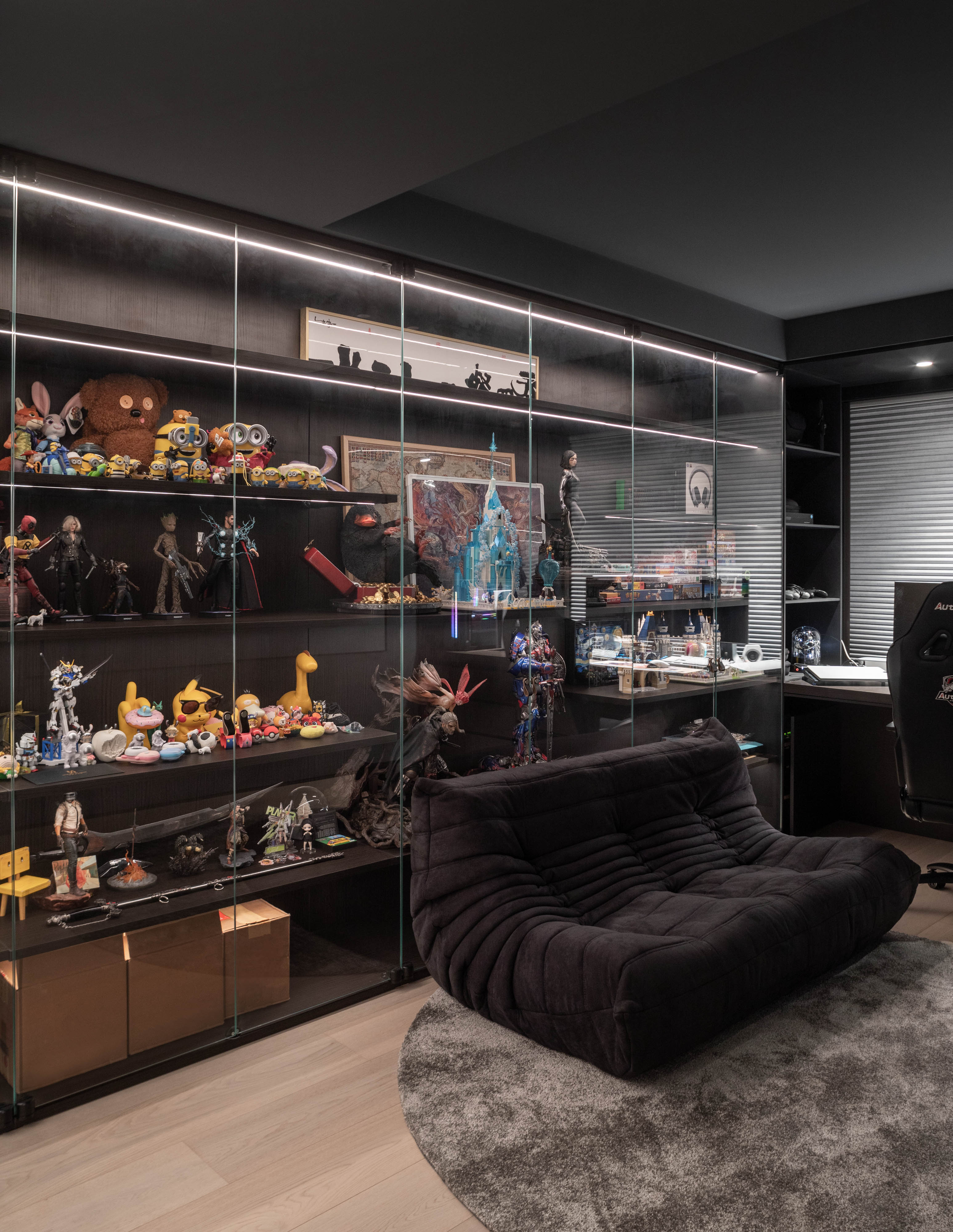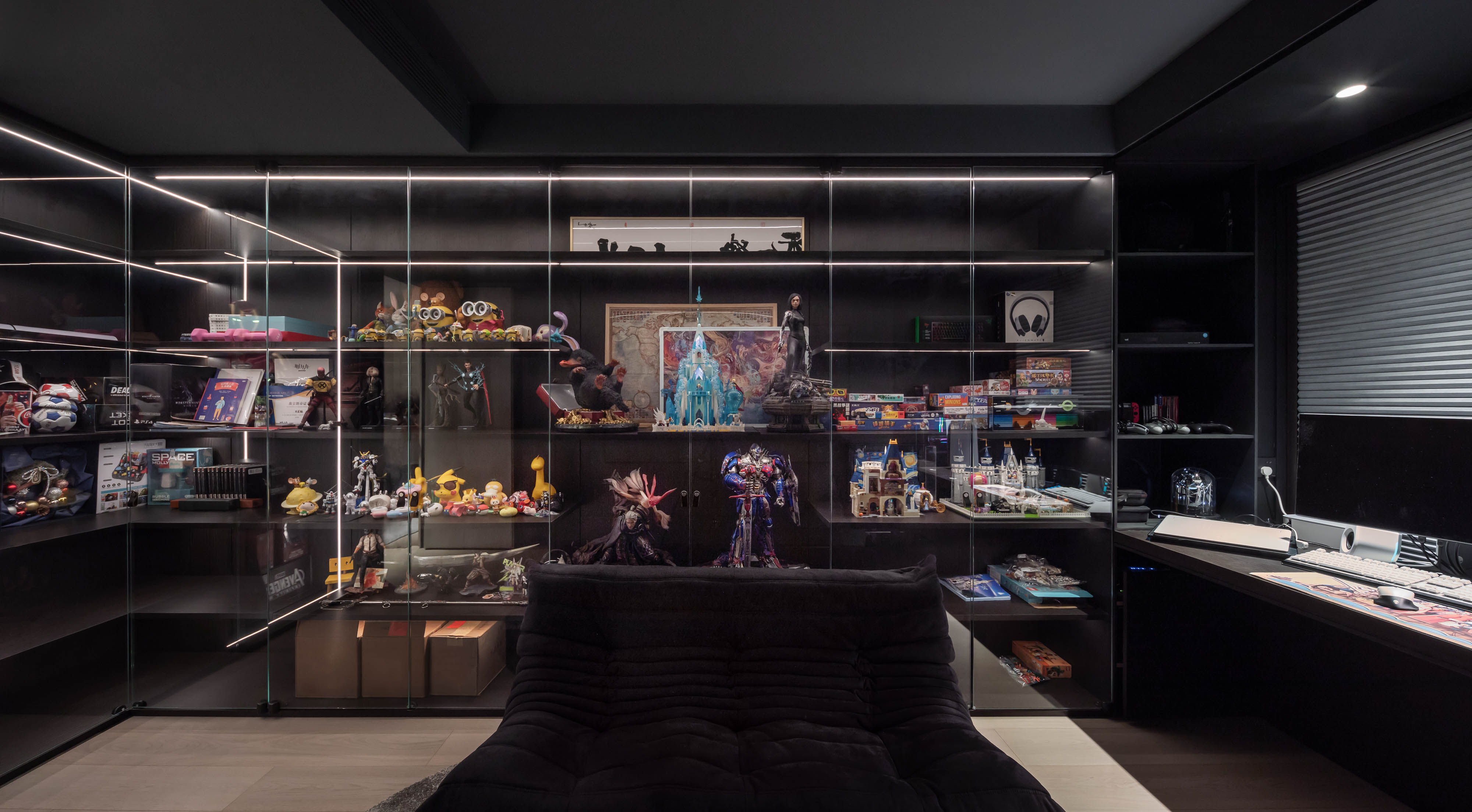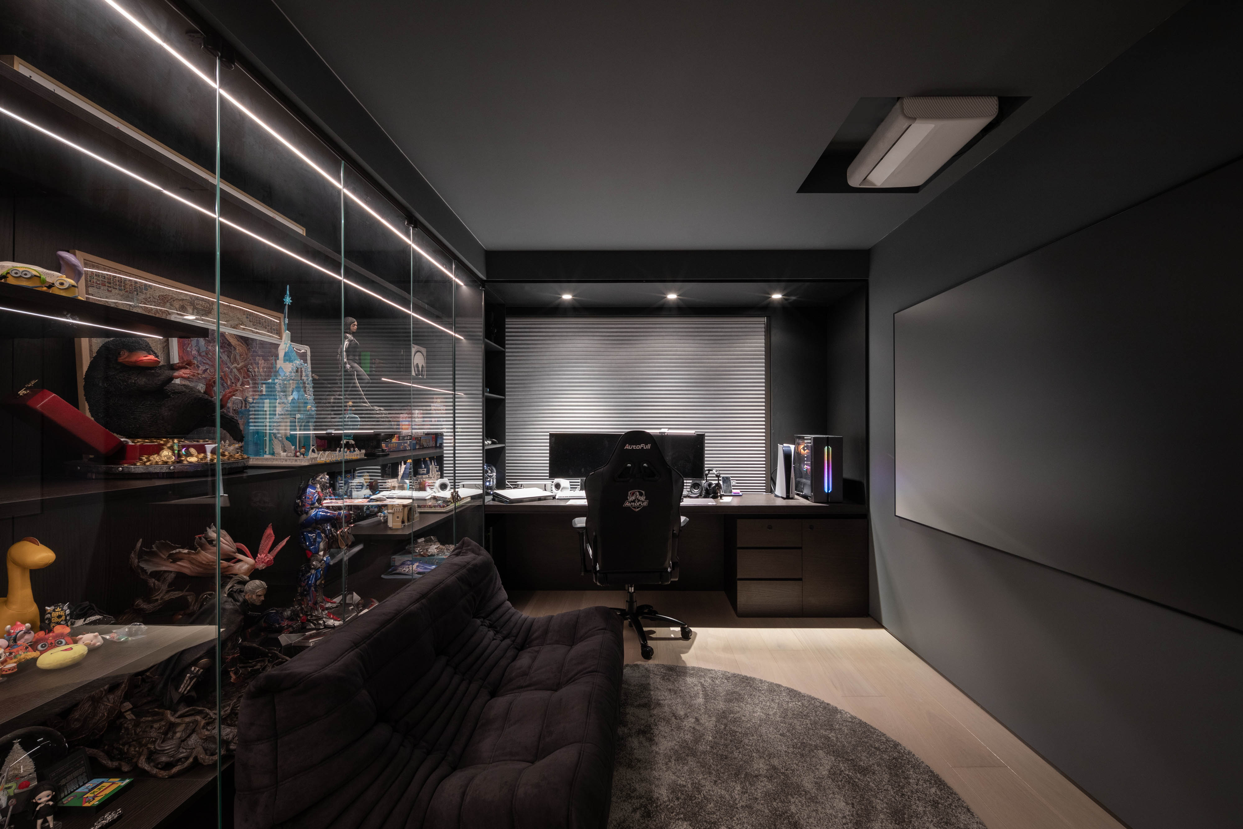 电竞房以纯粹的“黑武士”风格打造,成为主人投入与狂欢的专属领地。深邃的黑色包裹整个空间,营造出沉浸式的氛围感。在精心设计的灯光布局下,冷峻的科技蓝光或RGB光带划破黑暗,如同夜空中交织的能量,瞬间点燃战斗的激情。这里不仅是性能至上的游戏战场,更是一处能让人彻底放松、卸下现实疲惫的精神庇护所。