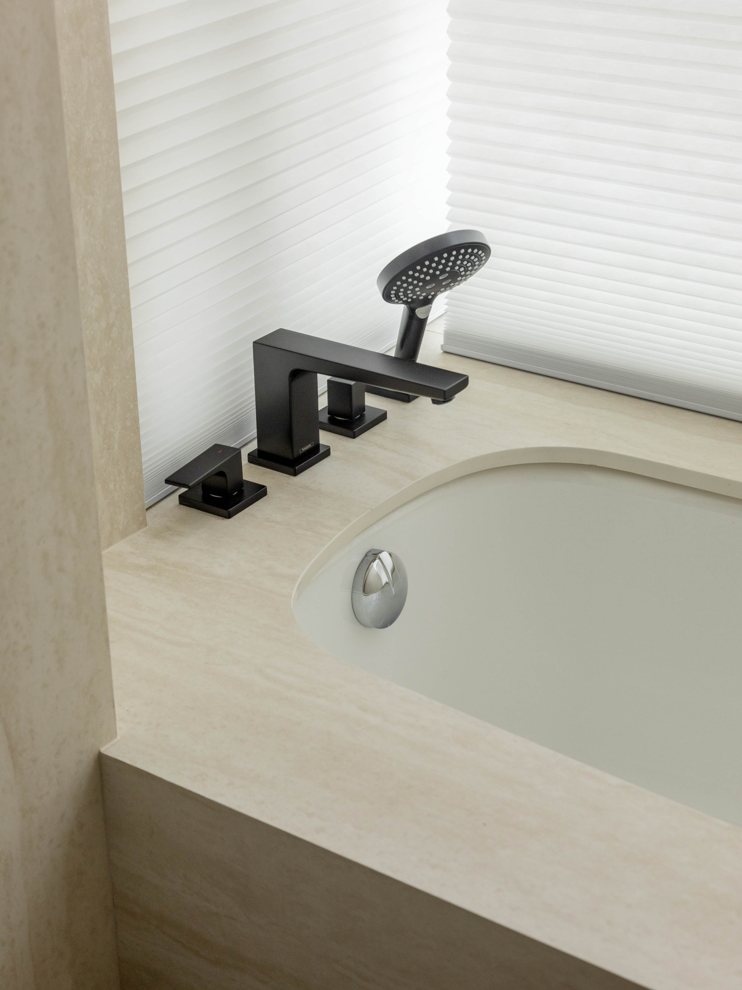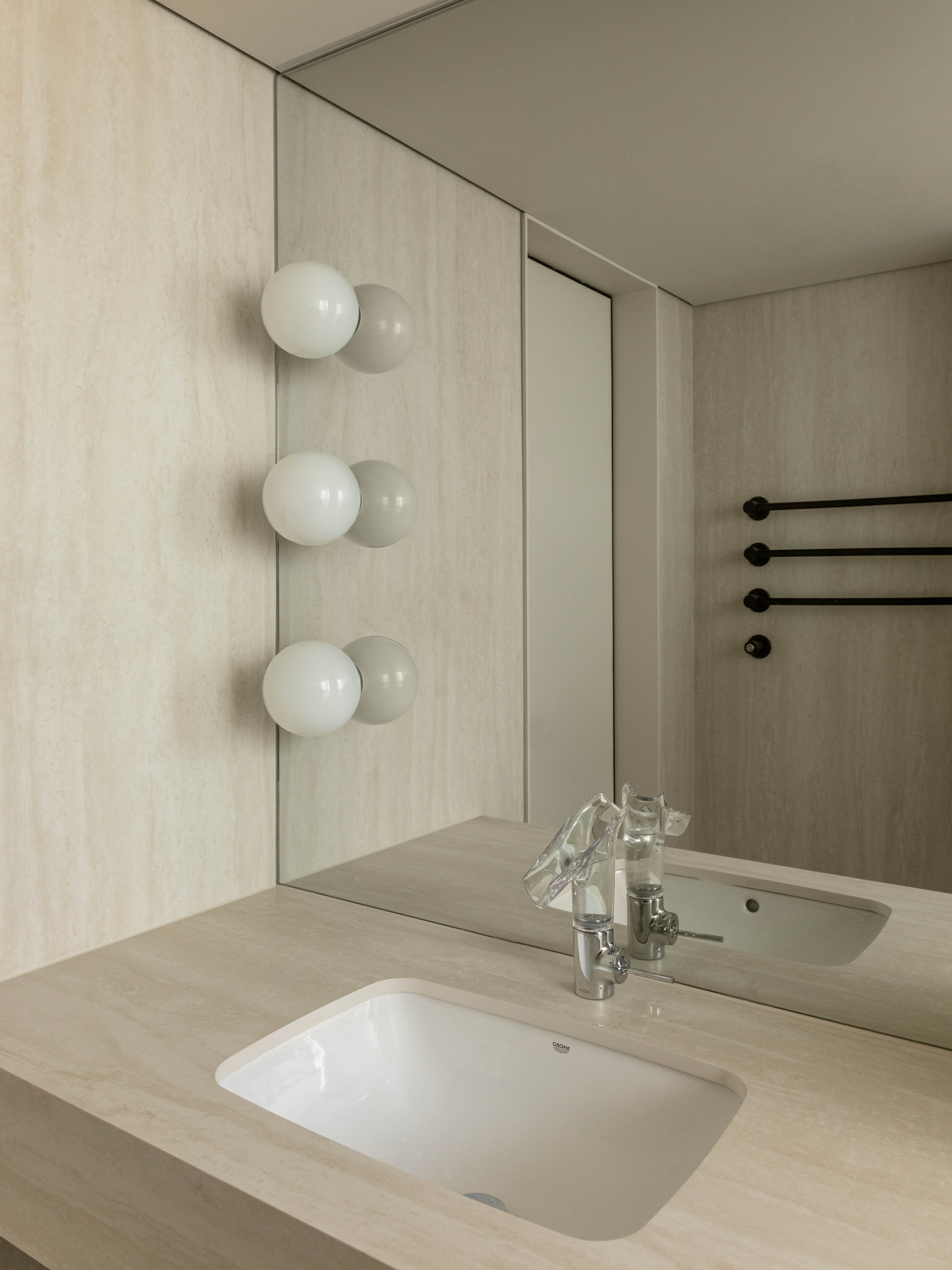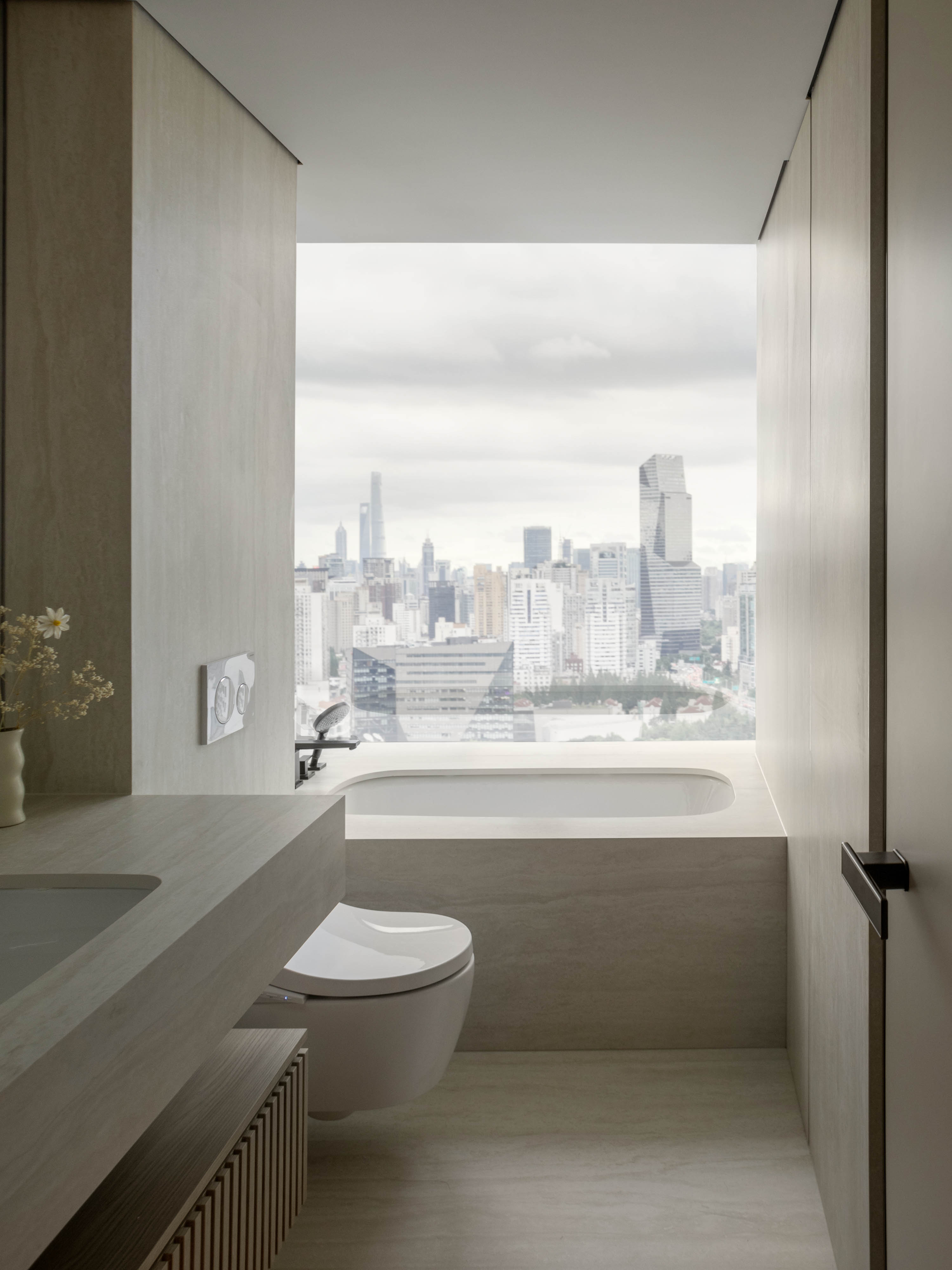 次卫的嵌入式浴缸被三面通透的玻璃精心包裹,构成一个轻盈的透明盒子。当夜幕降临,沉浸于温暖的水中,视线便可越过窗沿,毫无阻碍地远眺璀璨的城市夜景。让每一次沐浴都成为一次抽离喧嚣、放飞思绪的神圣仪式。